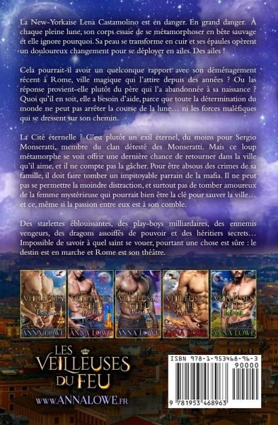 La New-Yorkaise Lena Castamolino est en danger. En grand danger. À chaque pleine lune, son corps essaie de se métamorphoser en bête sauvage et elle ignore pourquoi. Sa peau se transforme en cuir et ses épaules opèrent un douloureux changement pour se déployer en ailes. Des ailes ! Cela pourrait-il avoir un quelconque rapport avec son déménagement récent à Rome, ville magique qui l'attire depuis des années ? Ou las réponse provient-elle plutôt du père qui l'a abandonnée à sa naissance ? Quoi qu'il en soit, elle a besoin d'aide, parce que toute la détermination du monde ne peut pas arrêter la course de la lune... ni les forces maléfiques qui se dressent sur son chemin. La Cité éternelle ? C'est plutôt un exil éternel, du moins pour Sergio Monseratti, membre du clan détesté des Monseratti. Mais ce loup métamorphe se voit offrir une dernière chance de retourner dans la ville qu'il aime, et il ne compte pas la gâcher. Pour être absous des crimes de sa famille, il doit faire tomber un impitoyable parrain de la mafia. Il ne peut pas se permettre la moindre distraction, et surtout pas de tomber amoureux de la femme mystérieuse qui pourrait bien être la clé pour sauver la ville... et ce, même si la passion entre eux est à son comble. Des starlettes éblouissantes, des play-boys milliardaires, des ennemis vengeurs, des dragons assoiffés de pouvoir et des héritiers secrets... Impossible de savoir à quel saint se vouer, pourtant une chose est sûre : le destin est en marche et Rome est son théâtre. Les Veilleuses du feu : Milliardaires et gardiens Préquelle : Rose éternelle Tome 1 : Les Veilleuses du feu : Paris Tome 2 : Les Veilleuses du feu : Londres Tome 3 : Les Veilleuses du feu : Rome Tome 4 : Les Veilleuses du feu : Portugal Tome 5 : Les Veilleuses du feu : Irlande Tome 6 : Les Veilleuses du feu : Écosse Tome 7 : Les Veilleuses du feu : Venise Tome 8 : Les Veilleuses du feu : Grèce Tome 9 : Les Veilleuses du feu : Suisse Le danger plane sur l'Europe, où un clan dragon impitoyable prévoit de prendre le pouvoir dans les villes les plus grandioses et les plus glamour. Les anciens Gardiens ont chargé une nouvelle génération de héros métamorphes de protéger leurs châteaux, leurs cathédrales et les rues pavées de leurs cités ancestrales... tout en recherchant la dernière des Veilleuses du feu, ces femmes convoitées par les seigneurs de l'ombre pour leur sang royal. Des femmes absolument intouchables pour les jeunes guerriers responsables de leur protection. Mais le destin, bien sûr, en a décidé autrement...