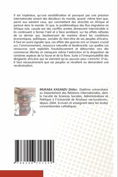 Il est impérieux, qu'une sensibilisation et pourquoi pas une pression internationale venant des décideurs du monde, quand- même bien que, parmi eux existent ceux, qui commettent des atrocités en Afrique et partout dans le monde. Et que, la problématique des flux migratoire en Afrique noir, causée par des conflits armées demeurent interminable si ils continuent à fermer l'oeil et à faire semblant, sur les effets néfastes de ce dernier qui; bouleversant de manière direct les conditions économiques, politiques, sociales du bien-être de ses peuples africains. Il faut en outre signaler que, ces effets des guerres ont un impact crucial sur; l'environnement, ressource naturelle et biodiversité. Les quelles ces ressources sont exploités frauduleusement et détournées vers des commerces illicites et menaçant même l'extinction et la disparition de certaines espèces de la faune et de la flore. Suite à l'irresponsabilité des dirigeants africains qui ne viennent qu'au pouvoir pour s'enrichir. D'où, il faut nécessairement que ses peuples se révoltent ou demandant une recolonisation.