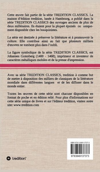 Cette uvre (édition relié) fait partie de la série TREDITION CLASSICS. La maison d édition tredition, basée à Hambourg, a publié dans la série TREDITION CLASSICS des ouvrages anciens de plus de deux millénaires. Ils étaient pour la plupart épuisés ou uniquement disponible chez les bouquinistes. La série est destinée à préserver la littérature et à promouvoir la culture. Avec sa série TREDITION CLASSICS, tredition à comme but de mettre à disposition des milliers de classiques de la littérature mondiale dans différentes langues et de les diffuser dans le monde entier.