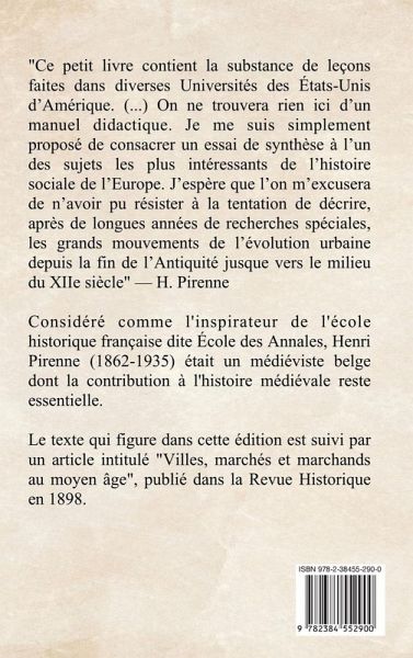 "Ce petit livre contient la substance de leçons faites dans diverses Universités des États-Unis d'Amérique. (...) On ne trouvera rien ici d'un manuel didactique. Je me suis simplement proposé de consacrer un essai de synthèse à l'un des sujets les plus intéressants de l'histoire sociale de l'Europe. J'espère que l'on m'excusera de n'avoir pu résister à la tentation de décrire, après de longues années de recherches spéciales, les grands mouvements de l'évolution urbaine depuis la fin de l'Antiquité jusque vers le milieu du XIIe siècle" - H. Pirenne Considéré comme l'inspirateur de l'école historique française dite École des Annales, Henri Pirenne (1862-1935) était un médiéviste belge dont la contribution à l'histoire médiévale reste essentielle. Le texte qui figure dans cette édition est suivi par un article intitulé "Villes, marchés et marchands au moyen âge", publié dans la Revue Historique en 1898.