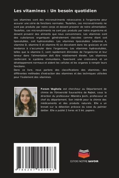 Les vitamines sont des micronutriments nécessaires à l'organisme pour assurer une série de fonctions normales. Toutefois, ces micronutriments ne sont pas produits par notre corps et doivent provenir de notre alimentation. Toutefois, ces micronutriments ne sont pas produits par notre organisme et doivent provenir des aliments que nous consommons. Les vitamines sont des substances organiques généralement classées comme étant soit liposolubles, soit hydrosolubles. Les vitamines liposolubles (vitamine A, vitamine D, vitamine E et vitamine K) se dissolvent dans les graisses et ont tendance à s'accumuler dans l'organisme. Les vitamines hydrosolubles, telles que la vitamine C, sont rapidement éliminées de l'organisme et leur teneur dans l'alimentation doit être relativement élevée. Les vitamines renforcent le système immunitaire, favorisent une croissance et un développement normaux et aident les cellules et les organes à remplir leurs fonctions.Dans ce livre, nous parlons des classifications des vitamines, des différentes méthodes d'extraction des vitamines et des techniques utilisées pour l'isolement des vitamines.