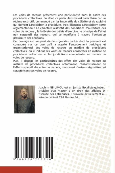 Les voies de recours présentent une particularité dans le cadre des procédures collectives. En effet, ce particularisme est caractérisé par un régime restrictif, commandé par les impératifs de célérité et de rapidité qui doivent caractériser la procédure. Trois éléments caractérisent cette réglementation : Le caractère restrictif des conditions d'ouverture des voies de recours ; la brièveté des délais d'exercice; le principe de l'effet non suspensif des recours, qui se manifeste à travers l'exécution provisoire des décisions. Cet ouvrage est composé de deux grandes parties dont la première est consacrée sur ce que qu'il a appelé l'encadrement juridique et organisationnel des voies de recours en matière de procédures collectives, où il indique les voies de recours consacrées en matière de procédures collectives et les juridictions compétentes en matière de voies de recours. Puis, il dégage les particularités des effets des voies de recours en matière de procédures collectives notamment, l'anéantissement de l'effet suspensif des voies de recours, mais aussi d'autres originalités qui caractérisent ces voies de recours.