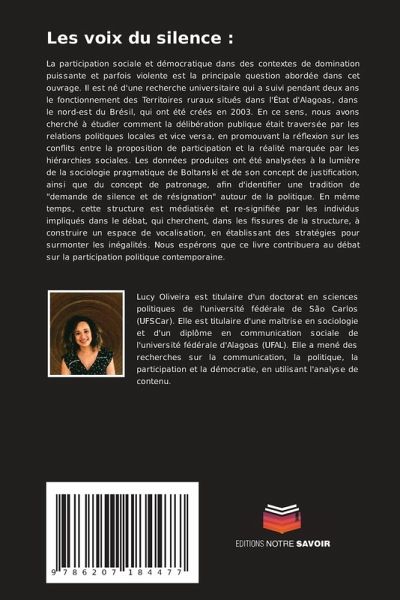 La participation sociale et démocratique dans des contextes de domination puissante et parfois violente est la principale question abordée dans cet ouvrage. Il est né d'une recherche universitaire qui a suivi pendant deux ans le fonctionnement des Territoires ruraux situés dans l'État d'Alagoas, dans le nord-est du Brésil, qui ont été créés en 2003. En ce sens, nous avons cherché à étudier comment la délibération publique était traversée par les relations politiques locales et vice versa, en promouvant la réflexion sur les conflits entre la proposition de participation et la réalité marquée par les hiérarchies sociales. Les données produites ont été analysées à la lumière de la sociologie pragmatique de Boltanski et de son concept de justification, ainsi que du concept de patronage, afin d'identifier une tradition de "demande de silence et de résignation" autour de la politique. En même temps, cette structure est médiatisée et re-signifiée par les individus impliqués dans le débat, qui cherchent, dans les fissures de la structure, à construire un espace de vocalisation, en établissant des stratégies pour surmonter les inégalités. Nous espérons que ce livre contribuera au débat sur la participation politique contemporaine.