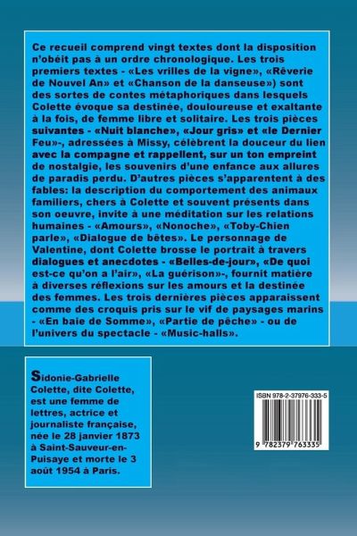 Colette, de son vrai nom Sidonie-Gabrielle Colette (1873-1954), est une écrivaine française célèbre pour ses romans explorant la liberté, la sensualité et la condition féminine, notamment la série Claudine et Gigi. Elle fut également journaliste, actrice et membre de l'Académie Goncourt.