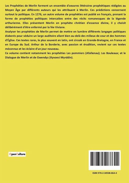 Les Prophéties de Merlin forment un ensemble d'oeuvres littéraires prophétiques rédigées au Moyen Âge par différents auteurs qui les attribuent à Merlin. Ces prédictions concernent surtout la politique. En 1276, un autre volume de prophéties est publié en français, prenant la forme de prophéties politiques intercalées entre des récits romanesques de la légende arthurienne. Elles présentent Merlin en prophète chrétien d'essence divine, il y choisit délibérément d'être enfermé par la fée Viviane. Analyser les prophéties de Merlin permet de mettre en lumière différents langages politiques élaborés pour séduire un large auditoire allant bien au-delà des milieux de cour et des hommes d'Église. Ces textes rares, le plus souvent en latin, ont circulé en Grande-Bretagne, en France et en Europe du Sud. Arthur de la Borderie, avec passion et érudition, revient sur ces textes méconnus et les éclaire d'un jour nouveau. Ce volume contient notamment les prophéties Les pommiers (Afallenau); Les Bouleaux; et le Dialogue de Merlin et de Gwendyz (Kyvoesi Myrddin).