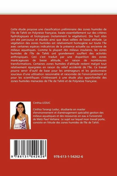 Cette étude propose une classification préliminaire des zones humides de l'île de Tahiti en Polynésie française, basée essentiellement sur des critères hydrologiques et biologiques (notamment la végétation). Dix huit sites ont été parcourus et étudiés ainsi que deux vallées de basse altitude. La végétation des zones humides est relativement homogène sur toute l'île avec certaines espèces indicatrices de la présence actuelle ou ancienne de milieux aquatiques. Comme la plupart des milieux insulaires, les zones humides de l'île de Tahiti ont grandement souffert des activités anthropiques. Ceci s'est traduit par une disparition des zones marécageuses de basse altitude, en raison de nombreuses transformations. Certaines zones humides d'altitude restent malgré tout relativement épargnées en raison du relief accidenté de l'île. Ce travail pourra servir d'outil de base pour les aménageurs et les gestionnaire soucieux d'une utilisation raisonnable et raisonnée de l'environnement et pour les scientifiques s'intéressant à une étude plus approfondie des zones humides menacées de l'île de Tahiti et de Polynésie française.