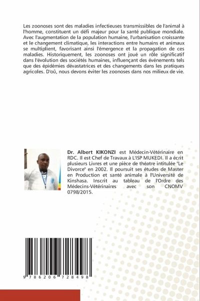 Les zoonoses sont des maladies infectieuses transmissibles de l'animal à l'homme, constituent un défi majeur pour la santé publique mondiale. Avec l'augmentation de la population humaine, l'urbanisation croissante et le changement climatique, les interactions entre humains et animaux se multiplient, favorisant ainsi l'émergence et la propagation de ces maladies. Historiquement, les zoonoses ont joué un rôle significatif dans l'évolution des sociétés humaines, influençant des événements tels que des épidémies dévastatrices et des changements dans les pratiques agricoles. D'oû, nous devons éviter les zoonoses dans nos milieux de vie.