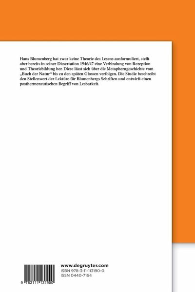 Hans Blumenbergs Schriften beziehen sich auf ein breites Textkorpus, liefern aber keine Theorie des Lesens. Die Studie verfolgt, wie Blumenberg theoretische Probleme an konkreten Textpassagen aufwirft; in Verbindung mit seinen Überlegungen zu Methode, Lebenswelt und Metapher erarbeitet sie einen posthermeneutischen Begriff von Lesbarkeit. Das Spektrum der Untersuchung erstreckt sich von der frühen Auseinandersetzung mit der Phänomenologie bis zu Lektüregängen im Umfeld der ästhetischen und metaphorologischen Schriften, etwa zu Plotin, Goethe, Fontane und Valéry. Schon in den Vorarbeiten zur Dissertation 1946/47 zeichnet sich ein Konzept der Rezeption ab, das auf die Ansprüche des vermeintlich Marginalen zielt. Derart öffnet sich das Verfahren zu einem Plural, der in der Tradition - wie ausführliche Analysen der "Lesbarkeit der Welt" (1981) zeigen - immer wieder zu tilgen versucht worden ist. Indem das Vorfeld der Thesenbildung beleuchtet wird, lässt sich eine anthropologische oder rein rhetoriktheoretische Deutung von Blumenbergs Werk in Frage stellen.