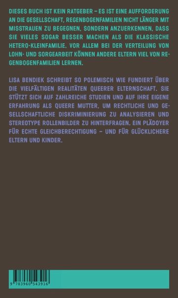 Dies ist kein Ratgeber. Dieses Buch ist ein Plädoyer dafür, queere Familien nicht länger als defizitär zu betrachten, sondern anzuerkennen, dass sie es sogar besser machen als die klassische Hetero-Kleinfamilie. Es erkundet queere Elternschaft und ihre vielfältigen Realitäten, die sich noch immer gegen rechtliche und gesellschaftliche Diskriminierung behaupten und den rechten Backlash mehr als andere fürchten müssen. Dieses Buch ist zugleich eine Analyse der Mechanismen, die in Hetero-Familien Ungleichheit zementieren, auch wenn Selbstbild und Anspruch dem längst entgegenstehen. Und nicht zuletzt ist es eine Anregung, »outside the box« zu denken und tief verankerte Grundannahmen über Elternschaft und Familie hinter sich zu lassen.Lisa Bendiek nutzt ihr Wissen als queere Mutter, das ihres Umfelds und die Ergebnisse zahlreicher Studien, um ein fundiertes Bild unterschiedlicher Familienmodelle zu zeichnen. Sie zeigt, wie tradierte Geschlechterrollen und eine Logik der Alternativlosigkeit in Hetero-Familien noch immer verhindern, dass Care-Arbeit und Berufstätigkeit gleichberechtigt aufgeteilt werden.Ressentiments wie der Sorge um das Kindeswohl in Regenbogenfamilien begegnet die Autorin mit derselben »empirisch fundierten Großkotzigkeit«, mit der sie Hetero-Familien nahelegt, sich im eigenen Interesse ein Beispiel an queeren Familien zu nehmen: für glücklichere Eltern und Kinder und für eine gleichberechtigtere Gesellschaft.