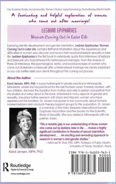 Exploring identity development and gender orientation, Minneapolis-based psychotherapist Jensen presents first-hand information about the experiences and difficulties of women who discover and reveal their newfound lesbian sexuality later in life. She also provides a rare collection of extensive quotes from interviews of lesbians and bisexual women who had entered into heterosexual marriages.