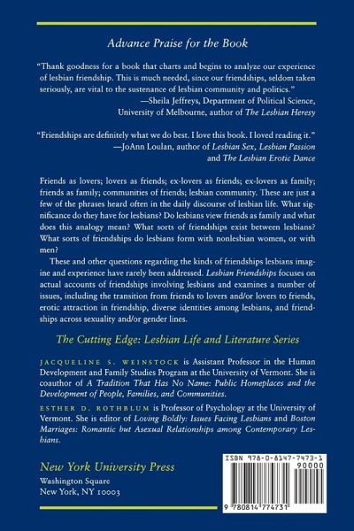 Friends as lovers; lovers as friends; ex-lovers as friends; ex-lovers as family; friends as family; communities of friends; lesbian community. These are just a few of the phrases heard often in the daily discourse of lesbian life. What significance do they have for lesbians? Do lesbians view friends as family and what does this analogy mean? What sorts of friendships exist between lesbians? What sorts of friendships do lesbians form with non-lesbian women, or with men? These and other questions regarding the kinds of friendships lesbians imagine and experience have rarely been addressed. Lesbian Friendships focuses on actual accounts of friendships involving lesbians and examines a number of issues, including the transition from friends to lovers and/or lovers to friends, erotic attraction in friendship, diverse identities among lesbians, and friendships across sexuality and/or gender lines.