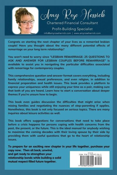 Lesbian remarriage "Lesbian Remarriage: 25 Questions to Ask and Answer for Lesbian Couples Before Remarriage" is not just a book-it is your indispensable guide to crafting a remarriage that stands the test of time. This insightful book offers a roadmap for navigating the complexities of remarriage and laying the groundwork for a partnership that is as enduring as it is fulfilling. Structured into nine insightful chapters, each one carefully curated to address the unique considerations of lesbian couples in remarriage, this book empowers you to delve deep, discuss openly, and understand each other profoundly before taking the next step of building a lifelong marriage of your dreams. "Lesbian Remarriage" is not just a book; it is a roadmap for building a resilient and fulfilling partnership. Whether you are embarking on a new chapter or seeking to strengthen an existing one, this book empowers you to ask the right questions and embark on a journey of love, understanding, and growth together. Do not miss this opportunity to transform your life! Secure your copy now and gain access to the free audio version using the link provided within.