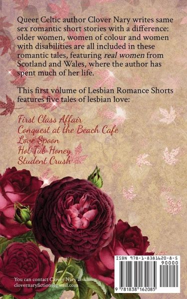 Queer Celtic author Clover Nary writes lesbian shorts with a difference. Older women, women of colour and women with disabilities are all included in these romantic tales, featuring real women from Scotland and Wales. This first volume of Lesbian Romance Shorts features five tales of lesbian love: First Class Affair An erotic lesbian short story of circa 5k, ideal for the morning commute (but pack a spare pair of panties!). When paralegal Natalie Lomax and wealthy banker Astrid Bergsson quite literally bump into each other outside an Edinburgh coffee house, it marks the start of a passionate encounter that comes to a climax aboard the train to Aberdeen. Conquest at the Beach Café Shy introvert Leigh Irvine decides to take refuge in the beach café one Saturday morning, when she is stood up by a friend. There she finds herself sat opposite an androgynous young woman with an air of mystery. Despite her own timidity and egged on by a work colleague, Leigh hands her phone number to the taciturn twenty something. It is decision she will not regret. Love Spoon Teenage lesbian Beth is stuck at home in a quiet Welsh Valley, nursing a broken heart. Feeling isolated socially and suffocated by her surroundings, the attention of a middle-aged friend of her mother's comes as a sudden shock. Despite her confusion at the sexual feelings the voluptuous Ffion arouses in her, Beth cannot shake off her attraction to the older woman. Will the age gap prove an insurmountable challenge or is Beth ready to let go of her own hang-ups? Hot Tub Honey Jilted at the altar by her ex, Daria, Jeni decides to continue with the honeymoon in Scotland. But she gets more than she bargains for, when she advertises for a companion to share the hot tub with her. Student Crush Jordie is a newly qualified teacher and lesbian. Anna is a mature student with a crush on her Political Sciences lecturer. Will Anna succeed in seducing Jordie, or will professional judgement win the day? ¿