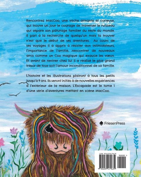 Rencontrez MacCoo, une vache aimante et curieuse, qui trouve un jour le courage de traverser le ruisseau qui sépare son pâturage familier du reste du monde. Il part à la recherche de quelqu'un mais la trouver n'est que le début de ses aventures. Au cours de ses voyages il a appris à résister aux intimidateurs, l'importance de l'amitié, rencontrer de nouveaux amis comme un Coo magique qui exauce les voeux. Et avant de rentrer chez lui il a réalisé le plus grand trésor de tous soit l'amour inconditionnel de sa famille. L'histoire et les illustrations plairont à tous les petits jusqu'à 9 ans. Ils seront initiés à de nouvelles expériences à l'extérieur de la maison. L'Escapade est le tome 1 d'une série d'aventures mettant en scène MacCoo.