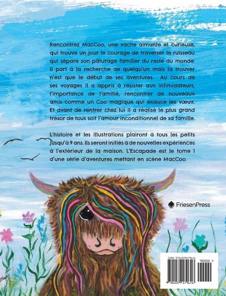 Rencontrez MacCoo, une vache aimante et curieuse, qui trouve un jour le courage de traverser le ruisseau qui sépare son pâturage familier du reste du monde. Il part à la recherche de quelqu'un mais la trouver n'est que le début de ses aventures. Au cours de ses voyages il a appris à résister aux intimidateurs, l'importance de l'amitié, rencontrer de nouveaux amis comme un Coo magique qui exauce les voeux. Et avant de rentrer chez lui il a réalisé le plus grand trésor de tous soit l'amour inconditionnel de sa famille. L'histoire et les illustrations plairont à tous les petits jusqu'à 9 ans. Ils seront initiés à de nouvelles expériences à l'extérieur de la maison. L'Escapade est le tome 1 d'une série d'aventures mettant en scène MacCoo.