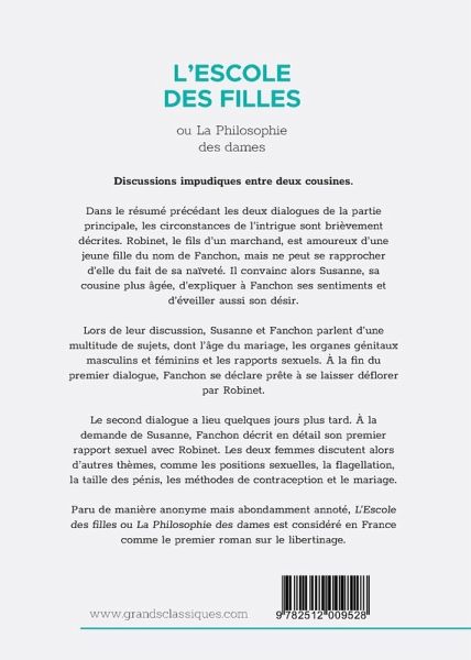 Discussions impudiques entre deux cousines. POUR UN PUBLIC AVERTI. Dans le résumé précédant les deux dialogues de la partie principale, les circonstances de l¿intrigue sont brièvement décrites. Robinet, le fils d¿un marchand, est amoureux d¿une jeune fille du nom de Fanchon, mais ne peut se rapprocher d¿elle du fait de sa naïveté. Il convainc alors Susanne, sa cousine plus âgée, d¿expliquer à Fanchon ses sentiments et d¿éveiller aussi son désir. Lors de leur discussion, Susanne et Fanchon parlent d¿une multitude de sujets, dont l¿âge du mariage, les organes génitaux masculins et féminins et les rapports sexuels. À la fin du premier dialogue, Fanchon se déclare prête à se laisser déflorer par Robinet. Le second dialogue a lieu quelques jours plus tard. À la demande de Susanne, Fanchon décrit en détail son premier rapport sexuel avec Robinet. Les deux femmes discutent alors d¿autres thèmes, comme les positions sexuelles, la flagellation, la taille des pénis, les méthodes de contraception et le mariage. Paru de manière anonyme mais abondamment annoté, L'Escole des filles ou La Philosophie des dames est considéré en France comme le premier roman sur le libertinage. EXTRAIT Epistre invitatoire aux filles C¿est une foible raison, mes dames, que celle de vos mères, pour vous défendre de sçavoir les choses qui vous doivent servir un jour, de dire qüelles ont peur que vous en usiez inconsidérément, et il vaudroit mieux, à mon advis, qüelles vous en donnassent une pleine licence, afin qüen choisissant vous-mêmes ce qui est bon, elles fissent esclater davantage par ce choix votre honesteté. Aussi je veux croire, mes belles, qüen ceste Escole vous prendrez seulement les choses qui vous sont propres, et que celles d¿entre vous qui auront envie d¿estre mariées auparavant n¿useront point de ces préceptes que quand il en sera temps, là où les autres qui auront plus de haste et qui prendront des amis par avance pour en essayer, le feront avec tant d¿adresse et de retenue devant le monde, qüelles ne témoigneront rien qui puisse choquer tant soit peu la bienséance et l¿honesteté. C¿est une belle chose que l¿honneur, dont il faut qüune fille soit jalouse comme de sa propre vie ; elle ne doibt non plus estre sans cet ornement que sans robe, et certainement elle n¿a pas l¿honneur et l¿esprit du monde quand elle n¿a pas l¿industrie et l¿adresse de cacher ce qüil ne faut pas qüon sçache. À PROPOS DE LA COLLECTION Retrouvez les plus grands noms de la littérature érotique dans notre collection Grands classiques érotiques. Autrefois poussés à la clandestinité et relégués dans « l'Enfer des bibliothèques », les auteurs de ces ¿uvres incontournables du genre sont aujourd'hui reconnus mondialement. Du Marquis de Sade à Alphonse Momas et ses multiples pseudonymes, en passant par le lyrique Alfred de Musset ou la féministe Renée Dunan, les Grands classiques érotiques proposent un catalogue complet et varié qui contentera tant les novices que les connaisseurs.