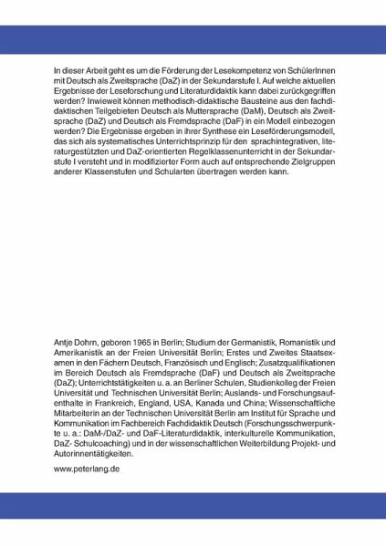 In dieser Arbeit geht es um die Förderung der Lesekompetenz von SchülerInnen mit Deutsch als Zweitsprache (DaZ) in der Sekundarstufe I. Auf welche aktuellen Ergebnisse der Leseforschung und Literaturdidaktik kann dabei zurückgegriffen werden? Inwieweit können methodisch-didaktische Bausteine aus den fachdidaktischen Teilgebieten Deutsch als Muttersprache (DaM), Deutsch als Zweitsprache (DaZ) und Deutsch als Fremdsprache (DaF) in ein Modell einbezogen werden? Die Ergebnisse ergeben in ihrer Synthese ein Leseförderungsmodell, das sich als systematisches Unterrichtsprinzip für den sprachintegrativen, literaturgestützten und DaZ-orientierten Regelklassenunterricht in der Sekundarstufe I versteht und in modifizierter Form auch auf entsprechende Zielgruppen anderer Klassenstufen und Schularten übertragen werden kann.