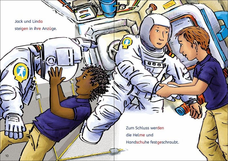 Ein gefährlicher Außeneinsatz im All wartet auf Jack und Linda: Die beiden Astronauten müssen so schnell wie möglich ein Ventil an der Weltraumstation reparieren - hoffentlich haben sie Erfolg! Mit Silbenfärbung und Leselernschrift Mit vielen Rätseln, die den Wortschatz erweitern Ideal zum Lesenlernen in der 1. Klasse