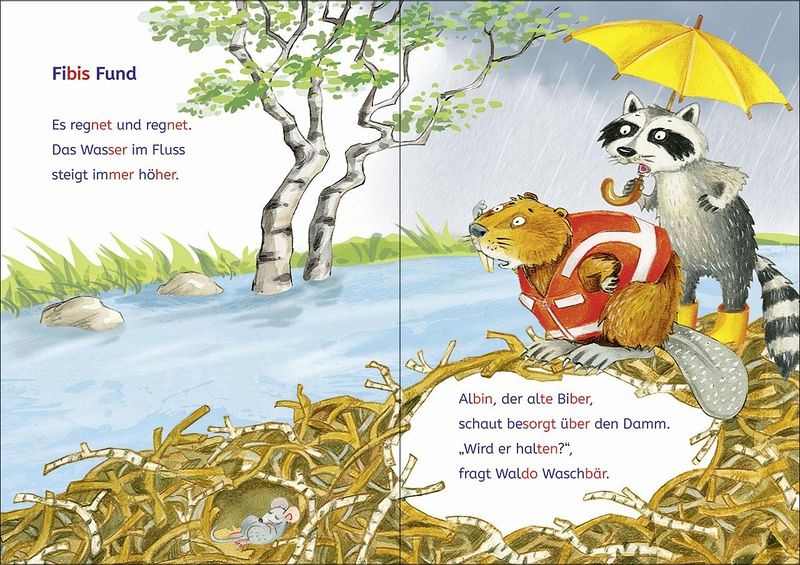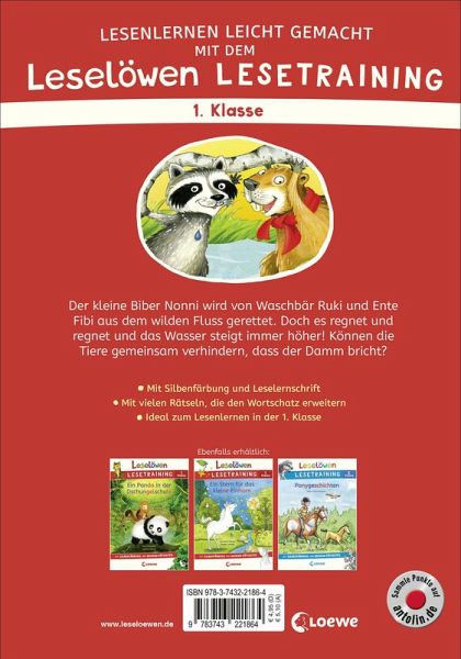Der kleine Biber Nonni wird von Waschbär Ruki und Ente Fibi aus dem wilden Fluss gerettet. Doch es regnet und regnet und das Wasser steigt immer höher! Können die Tiere gemeinsam verhindern, dass der Damm bricht? Mit Silbenfärbung und Leselernschrift Mit vielen Rätseln, die den Wortschatz erweitern Ideal zum Lesenlernen in der 1. KlasseLesenlernen ganz einfach - mit demLeselöwen Lesetraining für die 1. Klasse! So wird jedes Kind ab 6 Jahren zu einem echten Leseprofi: Die spannenden Geschichten motivieren zum Lesen, farbig markierte Silben erleichtern es, den Sinn der Wörter zu erfassen, und die vielen tollen Rätsel am Ende des Buches sorgen für eine spielerische Erweiterung des Wortschatzes.
