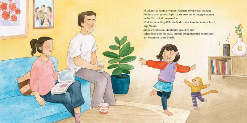 Mila freut sich riesig: Sie darf zum Kindertanzen gehen. Im großen Saal in der Tanzschule ist viel Platz zum Springen und Tanzen. Mila und die anderen Kinder hüpfen im Takt der Musik, balancieren auf Zehenspitzen, machen große Froschsprünge und üben gemeinsam einen Schmetterlingstanz.