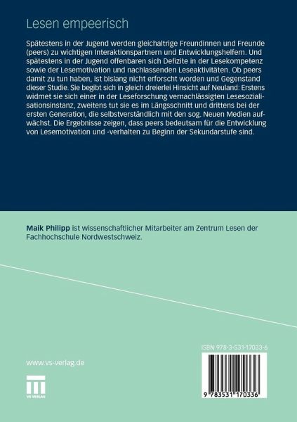 Spätestens in der Jugend werden gleichaltrige Freundinnen und Freunde (peers) zu wichtigen Interaktionspartnern und Entwicklungshelfern. Und spätestens in der Jugend offenbaren sich Defizite in der Lesekompetenz sowie der Lesemotivation und nachlassende Leseaktivitäten. Ob peers damit zu tun haben, ist bislang nicht erforscht worden und Gegenstand dieser Studie. Sie begibt sich in gleich dreierlei Hinsicht auf Neuland: Erstens widmet sie sich einer in der Leseforschung vernachlässtigten Lesesozialisationsinstanz, zweitens tut sie es im Längsschnitt und drittens bei der ersten Generation, die selbstverständlich mit den sog. Neuen Medien aufwächst. Die Ergebnisse zeigen, dass peers bedeutsam für die Entwicklung von Lesemotivation und -verhalten zu Beginn der Sekundarstufe sind.