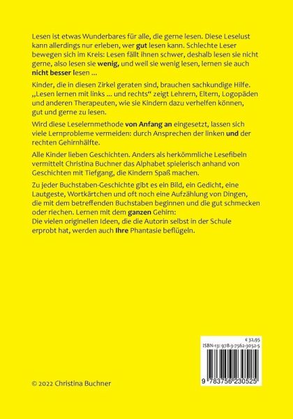 Lesen ist etwas Wunderbares für alle, die gerne lesen. Diese Leselust kann allerdings nur erleben, wer gut lesen kann. Schlechte Leser bewegen sich im Kreis: Lesen fällt ihnen schwer, deshalb lesen sie nicht gerne, also lesen sie wenig, und weil sie wenig lesen, lernen sie auch nicht besser lesen.Kinder, die in diesen Zirkel geraten sind, brauchen sachkundige Hilfe. "Lesen lernen mit links...und rechts" zeigt Lehrern, Eltern, Logopäden und anderen Therapeuten, wie sie KIndern dazu verhelfen können, gut und gerne zu lesen. Wird diese Leselernmethode von Anfang an eingesetzt, lassen sich viele Lernprobleme vermeiden: durch Ansprechen der linken und rechten Gehirnhälfte.Alle Kinder lieben Geschichten. Anders als herkömmliche Lesefibeln vermittelt Christina Buchner das Alphabet spielerisch anhand von Geschichten mit Tiefgang, die Kindern Spaß machen. Zu jeder Buchstaben-Geschichte gibt es ein Bild, ein Gedicht, eine Lautgeste, Wortkärtchen und oft noch eine Aufzählung von Dingen, die mit dem betreffenden Buchstaben beginnen und die gut schmecken oder riechen. Lernen mit dem ganzen Gehirn:Die vielen originellen Ideen, die die Autorin selbst in der Schule erprobt hat, werden auch Ihre Phantasie beflügeln.