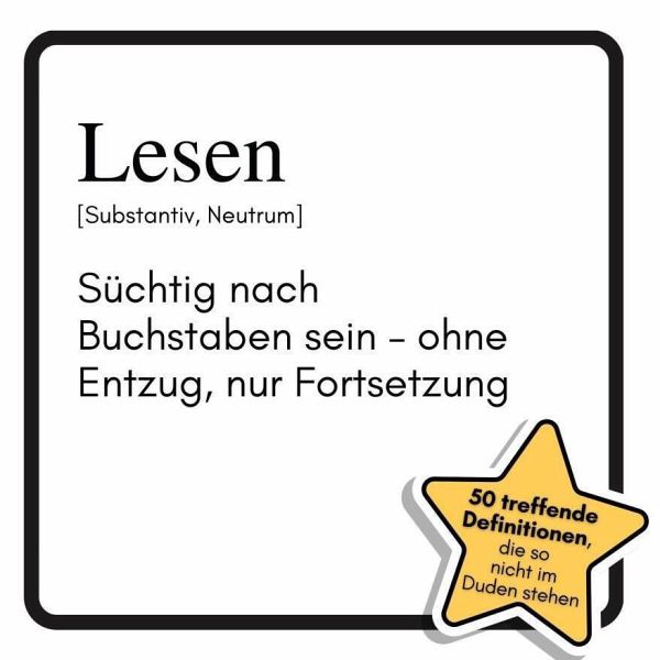 Achtung, Suchtgefahr: Wer einmal in "Lesen: Süchtig nach Buchstaben sein - ohne Entzug, nur Fortsetzung" blättert, wird nie wieder aufhören wollen! Hier werden Bücher nicht nur verschlungen, sondern mit einem Augenzwinkern seziert - von Lesezeichen bis Leseratte, von Kopfkino bis Klappentext. 50 Begriffe rund ums Lesen werden so humorvoll und pointiert erklärt, dass selbst eingefleischte Bücherwürmer Neues entdecken.Für wen dieses Buch optimal geeignet ist:- Für alle, die Bücher lieben und über ihre Eigenheiten schmunzeln können- Für Leseratten, die originelle Geschenkideen suchen- Für Freunde von Wortwitz und kreativen IllustrationenEin Fest für alle, die das Lesen feiern: Jede Definition bringt die kleinen und großen Eigenheiten des Bücherkosmos auf den Punkt, begleitet von einer passenden Illustration. Ob als Geschenk, für den eigenen Bücherschrank oder als Inspiration für den nächsten Lesemarathon - dieses Buch macht Lust auf mehr.Das erwartet den Käufer:- 50 witzige Definitionen rund ums Lesen- Passende Illustrationen zu jedem Begriff- Charmanter Lesespaß für Buchliebhaber- Ideales Geschenk für Literaturfans