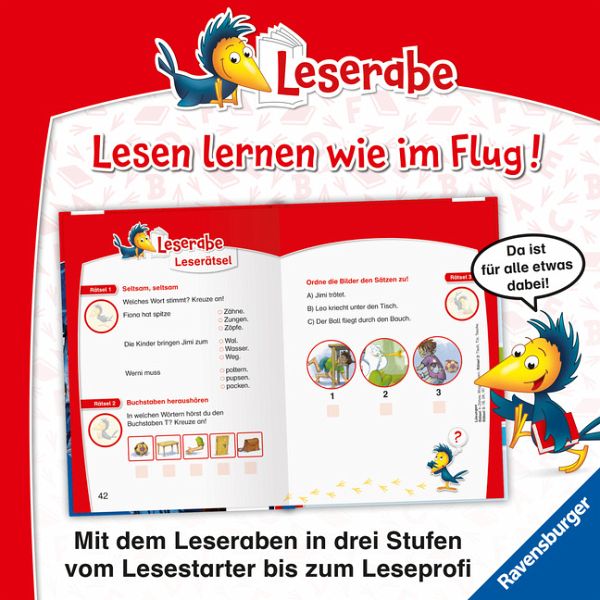 Lesen lernen wie im Flug! Die Kinderbücher der Reihe Leserabe - 1. Lesestufe wurden mit Pädagogen entwickelt und richten sich an Leseanfänger ab der 1. Klasse. Kurze Texte in großer Fibelschrift sichern erste Leseerfolge und steigern die Lesekompetenz von Mädchen und Jungen ab 6 Jahren. Empfohlen von Stiftung Lesen, gelistet bei Antolin.
