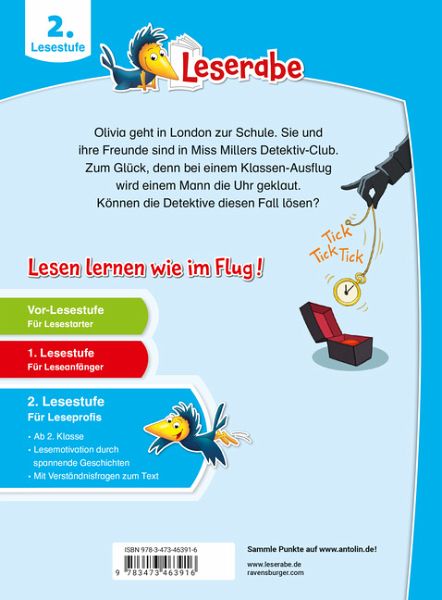 Olivia und ihre Freunde aus dem Detektivclub sind in London einem spannenden Fall auf der Spur: Eine wertvolle Uhr wurde gestohlen! Von Big Ben verfolgen die Detektive die Verdächtigen zum Buckingham Palace und zum Trafalgar Square. Wird es ihnen mithilfe von Hund Elvis gelingen, die Diebe zu stellen und die Uhr ihrem Besitzer zurückzugeben?