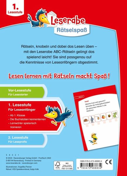 Rätseln, knobeln und dabei das Lesen üben - mit den Leserabe Abc-Rätseln gelingt das spielend leicht! Die verwendeten Wörter entsprechen dem Grundwortschatz ab der 1.Klasse und sind somit genau auf die Kenntnisse von Leseanfängern abgestimmt.