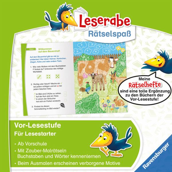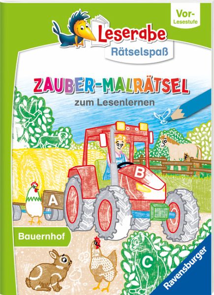 Malen, rätseln und dabei erstes Lesen erleben - mit den Leserabe Zauber-Malrätseln gelingt das spielend leicht! Kinder ab 5 Jahren malen altersgerechte Bilder zu ihrem Lieblingsthema Bauernhof aus, entdecken dabei verborgene Motive und Buchstaben und lösen so die Aufgaben. Die Rätsel sind passgenau auf die Kenntnisse von Lesestartern abgestimmt. Die Motive sorgen für großen Spaß und laden zum Entdecken erster Buchstaben ein. Da wächst die Lust am Lesenlernen ganz von allein.