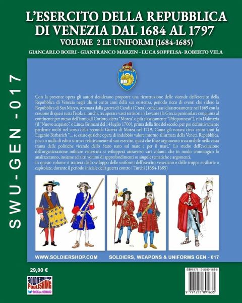 Con la presente opera gli autori desiderano proporre una ricostruzione delle vicende dell'esercito della Repubblica di Venezia negli ultimi cento anni della sua esistenza, periodo ricco di eventi che videro la Repubblica di San Marco, stremata dalla guerra di Candia (Creta), conclusasi disastrosamente nel 1669 con la cessione di quasi tutta l'isola ai turchi, recuperare vasti territori in Levante (la Grecia peninsulare congiunta al continente per messo dell'istmo di Corinto, detta "Morea", o più classicamente "Peloponneso"), e in Dalmazia (il "Nuovo acquisto", o Linea Grimani del 14 luglio 1700), prima della fine del secolo, per poi definitivamente perderne molti nel corso della seconda Guerra di Morea nel 1719. Come già notava circa cento anni fa Eugenio Barbarich "... se esiste qualche opera di indubbio valore intorno all'armata della Veneta Repubblica, poco o nulla di edito si trova relativamente al suo esercito, quasi che fosse argomento trascurabile nella vasta trama delle politiche vicende dello Stato nato sul mare e per il mare." Lo studio dell'evoluzione dell'organizzazione militare veneziana si svilupperà attraverso vari volumi, che in modo cronologico lo analizzeranno, insieme ad altri volumi di approfondimenti su singole tematiche e argomenti. In questo volume si tratterà dello sviluppo delle uniformi dell'esercito veneziano e delle truppe ausiliarie o capitolate, durante il periodo iniziale della guerra contro i Turchi (1684-1685).