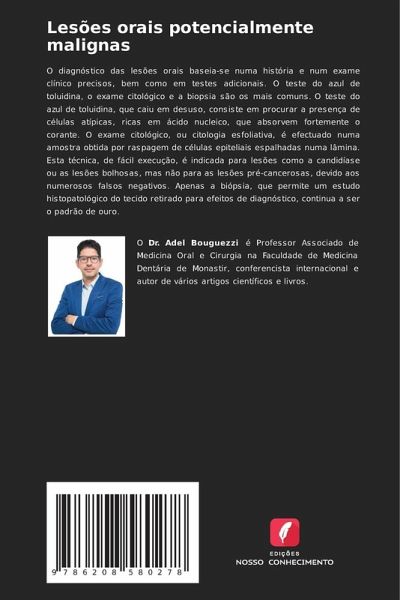 O diagnóstico das lesões orais baseia-se numa história e num exame clínico precisos, bem como em testes adicionais. O teste do azul de toluidina, o exame citológico e a biopsia são os mais comuns. O teste do azul de toluidina, que caiu em desuso, consiste em procurar a presença de células atípicas, ricas em ácido nucleico, que absorvem fortemente o corante. O exame citológico, ou citologia esfoliativa, é efectuado numa amostra obtida por raspagem de células epiteliais espalhadas numa lâmina. Esta técnica, de fácil execução, é indicada para lesões como a candidíase ou as lesões bolhosas, mas não para as lesões pré-cancerosas, devido aos numerosos falsos negativos. Apenas a biópsia, que permite um estudo histopatológico do tecido retirado para efeitos de diagnóstico, continua a ser o padrão de ouro.