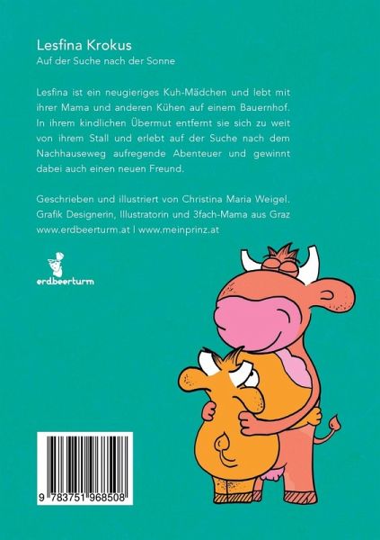 Lesfina KrokusAuf der Suche nach der SonneLesfina ist ein neugieriges Kuh-Mädchen und lebt mit ihrer Mama und anderen Kühen auf einem Bauernhof. In ihrem kindlichen Übermut entfernt sie sich zu weit von ihrem Stall und erlebt auf der Suche nach dem Nachhauseweg aufregende Abenteuer und gewinnt dabei auch einen neuen Freund.Geschrieben und illustriert von Christina Maria Weigel.Grafik Designerin, Illustratorin und 3fach-Mama aus Grazwww.erdbeerturm.at www.meinprinz.at