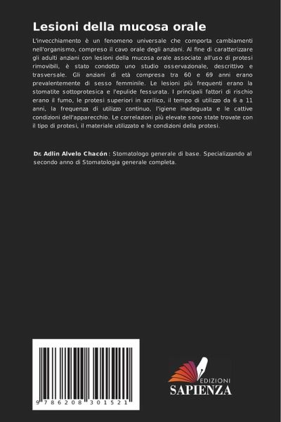 L'invecchiamento è un fenomeno universale che comporta cambiamenti nell'organismo, compreso il cavo orale degli anziani. Al fine di caratterizzare gli adulti anziani con lesioni della mucosa orale associate all'uso di protesi rimovibili, è stato condotto uno studio osservazionale, descrittivo e trasversale. Gli anziani di età compresa tra 60 e 69 anni erano prevalentemente di sesso femminile. Le lesioni più frequenti erano la stomatite sottoprotesica e l'epulide fessurata. I principali fattori di rischio erano il fumo, le protesi superiori in acrilico, il tempo di utilizzo da 6 a 11 anni, la frequenza di utilizzo continuo, l'igiene inadeguata e le cattive condizioni dell'apparecchio. Le correlazioni più elevate sono state trovate con il tipo di protesi, il materiale utilizzato e le condizioni della protesi.
