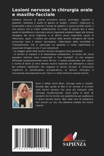 Sebbene nessuna di queste procedure possa, purtroppo, "guarire" il paziente, l'obiettivo è quello di gestire al meglio i sintomi, migliorare la funzionalità e dare al paziente il tempo di adattarsi a questi terribili eventi, il che spesso non è molto soddisfacente. Lo scopo di questa tesi è stato quello di identificare e discutere alcuni importanti problemi legati alla lesione iatrogena del nervo trigemino e di offrire alcuni importanti spunti di riflessione, quali: - I sintomi più comuni della lesione iatrogena del nervo sensoriale sono il dolore neuropatico, l'alterazione della sensibilità e l'intorpidimento. Ciò si ripercuote sul paziente in modo significativo e spiacevole (meglio se con il suo consenso!).- La maggior parte delle lesioni nervose iatrogene sono prevenibili.- In termini di impianti e di odontoiatria endodontica, le lesioni del nervo alveolare inferiore sono irreversibili e "non risolvibili" se non vengono affrontate tempestivamente entro 30 ore.- I metodi preoperatori per ridurre il rischio di danni ai nervi devono essere esplorati con attenzione a causa dei problemi significativi che seguono le lesioni nervose. È necessario migliorare la pianificazione pre-operatoria, la tecnica chirurgica e l'assistenza post-operatoria per ridurre e infine eliminare queste lesioni.