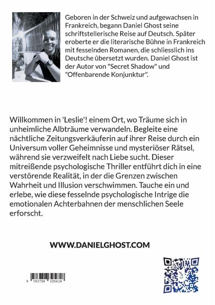 Willkommen in 'Leslie'! einem Ort, wo Träume sich in unheimliche Albträume verwandeln. Begleite eine nächtliche Zeitungsverkäuferin auf ihrer Reise durch ein Universum voller Geheimnisse und mysteriöser Rätsel, während sie verzweifelt nach Liebe sucht. Dieser mitreißende psychologische Thriller entführt dich in eine verstörende Realität, in der die Grenzen zwischen Wahrheit und Illusion verschwimmen. Tauche ein und erlebe, wie diese fesselnde psychologische Intrige die emotionalen Achterbahnen der menschlichen Seele erforscht.Besuche www.danielghost.com und entdecke dieses faszinierende Universum.…mehr