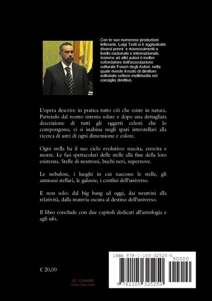 L'opera descrive in pratica tutto ciò che esiste in natura. Partendo dal nostro sistema solare e dopo una dettagliata descrizione di tutti gli oggetti celesti che lo compongono, ci si inabissa negli spazi interstellari alla ricerca di astri di ogni dimensione e colore. Ogni stella ha il suo ciclo evolutivo: nascita, crescita e morte. Le fasi spettacolari delle stelle alla fine della loro esistenza. Stelle di neutroni, buchi neri, supernove. Le nebulose, i luoghi in cui nascono le stelle, gli ammassi stellari, le galassie, i confini dell'universo. E non solo: dal big bang ad oggi, dai neutrini alla relatività, dalla materia oscura al destino dell'universo. Il libro conclude con due capitoli dedicati all'astrologia e agli ufo.