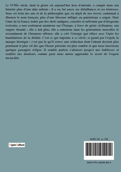 Le XVIIIe siècle, dont la gloire est aujourd¿hui hors d¿atteinte, a compté dans son histoire plus d¿une date néfaste ; il a eu, lui aussi, ses défaillances et ses tristesses. Sous cet éclat des arts et de la philosophie qui, en dépit de nos revers, continuait à illustrer le nom français, plus d¿une blessure infligée au patriotisme a saigné. Mais l¿âme de la France, trahie par des chefs indignes, consolée et raffermie par d¿éloquents écrivains, a non seulement maintenu sur l¿Europe, à force de génie civilisateur, son empire ébranlé ; elle a fait plus, elle a entretenu dans les générations nouvelles le ressentiment de l¿honneur offensé, elle a créé l¿énergie qui efface avec l¿épée les humiliations de la défaite. C¿est ce qui imprime à ce siècle, si grand par l¿esprit, la marque héroïque ; c¿est par là qüil exerce une séduction dont l¿attrait devient plus pénétrant et plus vif dès que l¿heure présente est plus sombre et que nous traversons quelque passagère éclipse. Il semble parfois s¿abaisser jusqüà nos faiblesses et souffrir nos douleurs, comme pour nous mieux apprendre le secret de l¿espoir invincible.