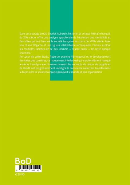 Dans cet ouvrage érudit, Charles Aubertin, historien et critique littéraire français du XIXe siècle, offre une analyse approfondie de l'évolution des mentalités et des idées qui ont façonné la société française au cours du XVIIIe siècle. Avec une plume élégante et une rigueur intellectuelle remarquable, l'auteur explore les multiples facettes de ce qu'il nomme « l'esprit public » de cette époque charnière. Au coeur de cette étude, Aubertin examine l'émergence et le développement des idées des Lumières, ce mouvement intellectuel qui a profondément marqué le siècle. Il analyse avec finesse…mehr