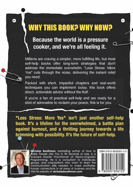 WHY THIS BOOK? WHY NOW? Because the world is a pressure cooker, and everyone's feeling it. "Less Stress, More Yes." is about a woman named Billie who was super stressed out all the time. She felt like she had way too much to do, was always worried, and just felt totally overwhelmed. The book tells how Billie realized she couldn't keep living like that. She wanted to feel better and find a way to live that didn't leave her drained all the time. So, she started trying out different things to manage her stress and take back her life. People need immediate relief, actionable steps they can implement today. "Less Stress: More Yes" delivers exactly that, cutting through the noise with short, impactful chapters and real-world techniques. "A high-octane, no-nonsense guide to shattering the shackles of stress and unlocking a life overflowing with opportunity and joy, delivered with a relentless pace and a page-turning punch." "Less Stress: More Yes isn't just another self-help book. It's a lifeline for the overwhelmed, a battle plan against burnout, and a thrilling journey towards a life brimming with possibility. It's the future of self-help-and it's going to be huge."