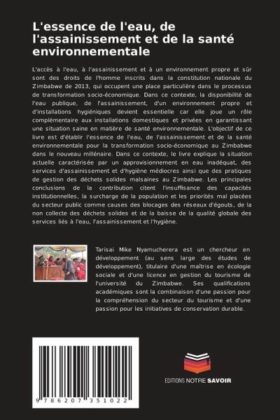 L'accès à l'eau, à l'assainissement et à un environnement propre et sûr sont des droits de l'homme inscrits dans la constitution nationale du Zimbabwe de 2013, qui occupent une place particulière dans le processus de transformation socio-économique. Dans ce contexte, la disponibilité de l'eau publique, de l'assainissement, d'un environnement propre et d'installations hygiéniques devient essentielle car elle joue un rôle complémentaire aux installations domestiques et privées en garantissant une situation saine en matière de santé environnementale. L'objectif de ce livre est d'établir l'essence de l'eau, de l'assainissement et de la santé environnementale pour la transformation socio-économique au Zimbabwe dans le nouveau millénaire. Dans ce contexte, le livre explique la situation actuelle caractérisée par un approvisionnement en eau inadéquat, des services d'assainissement et d'hygiène médiocres ainsi que des pratiques de gestion des déchets solides malsaines au Zimbabwe. Les principales conclusions de la contribution citent l'insuffisance des capacités institutionnelles, la surcharge de la population et les priorités mal placées du secteur public comme causes des blocages des réseaux d'égouts, de la non collecte des déchets solides et de la baisse de la qualité globale des services liés à l'eau, l'assainissement et l'hygiène.