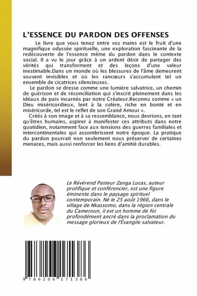 Le livre que vous tenez entre vos mains est le fruit d'une magnifique odyssée spirituelle, une exploration fascinante de la redécouverte de l'essence même du pardon dans le contexte social. Il a vu le jour grâce à un ardent désir de partager des vérités qui transforment et des leçons d'une valeur inestimable.Dans un monde où les blessures de l'âme demeurent souvent invisibles et où les rancoeurs s'accumulent tel un ensemble de cicatrices silencieuses. Le pardon se dresse comme une lumière salvatrice, un chemin de guérison et de réconciliation qui s'inscrit pleinement dans les idéaux de paix incarnés par notre Créateur.Reconnu comme « un Dieu miséricordieux, lent à la colère, riche en bonté et en miséricorde, tel est le reflet de son Grand Amour ». Créés à son image et à sa ressemblance, nous devrions, en tant qu'êtres humains, aspirer à manifester ces attributs dans notre quotidien, notamment face aux tensions des guerres familiales et intercontinentales qui assombrissent notre époque. La pratique du pardon pourrait non seulement nous préserver de certaines menaces, mais aussi renforcer les liens d'amitié durables.