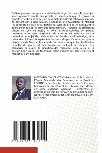 Ce livre propose une approche détaillée de la gestion du cycle de projet, spécifiquement adapté aux projets en santé publique. Il couvre les aspects essentiels de la gestion de projet, de l'identification à la clôture, en passant par la planification, l'exécution, et l'évaluation. Il introduit les concepts de base de la gestion du cycle de projet, en expliquant le cadre théorique et les principes fondamentaux. Il aborde les différentes phases du cycle de projet, les rôles et responsabilités des parties prenantes, et les objectifs généraux de la gestion de projet. Il couvre la définition des objectifs, l'élaboration du plan de travail, le budget, et le calendrier. Il introduit également les outils de planification tels que le diagramme de Gantt et la méthode du chemin critique. La planification détaillée du projet est approfondie ici, incluant la création d'un calendrier de projet, la définition des ressources nécessaires, et la gestion des risques. Les techniques pour élaborer des plans réalistes et réalisables sont discutées.