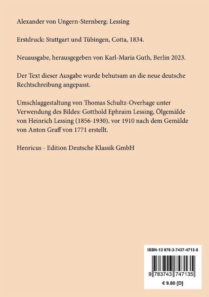 Alexander von Ungern-Sternberg: LessingErstdruck: Stuttgart und Tübingen, Cotta, 1834.Neuausgabe, herausgegeben von Karl-Maria Guth, Berlin 2023.Der Text dieser Ausgabe wurde behutsam an die neue deutsche Rechtschreibung angepasst.Umschlagabbildung: Gotthold Ephraim Lessing, Ölgemälde von Heinrich Lessing (1856-1930), vor 1910 nach dem Gemälde von Anton Graff von 1771 erstelltGesetzt aus der Minion Pro, 11 pt.Die Sammlung Hofenberg erscheint im Verlag Henricus - Edition Deutsche Klassik GmbH, Berlin