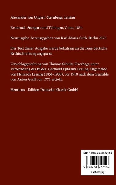 Alexander von Ungern-Sternberg: LessingErstdruck: Stuttgart und Tübingen, Cotta, 1834.Neuausgabe, herausgegeben von Karl-Maria Guth, Berlin 2023.Der Text dieser Ausgabe wurde behutsam an die neue deutsche Rechtschreibung angepasst.Umschlagabbildung: Gotthold Ephraim Lessing, Ölgemälde von Heinrich Lessing (1856-1930), vor 1910 nach dem Gemälde von Anton Graff von 1771 erstelltGesetzt aus der Minion Pro, 11 pt.Die Sammlung Hofenberg erscheint im Verlag Henricus - Edition Deutsche Klassik GmbH, Berlin