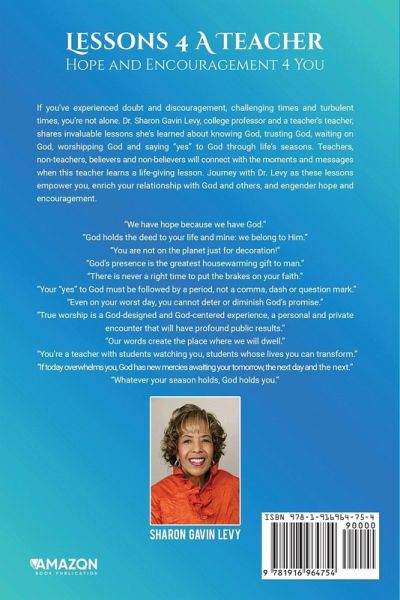 If you've experienced doubt and discouragement, challenging times, and turbulent times, you're not alone. Dr. Sharon Gavin Levy, college professor, and a teacher's teacher, shares invaluable lessons she's learned about knowing God, trusting God, waiting on God, worshiping God, and saying "yes" to God through life's seasons. Teachers, non-teachers, believers, and non-believers will connect with the moments and messages when this teacher learns a life-giving lesson. Journey with Dr. Levy as these lessons empower you, enrich your relationship with God and others and engender hope and encouragement.