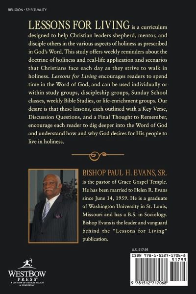 Lessons for Living is a curriculum designed to help Christian leaders shepherd, mentor, and disciple others in the various aspects of holiness as prescribed in God's Word. This study offers weekly reminders about the doctrine of holiness and real-life application and scenarios that Christians face each day as they strive to walk in holiness. Lessons for Living encourages readers to spend time in the Word of God, and can be used individually or within study groups, discipleship groups, Sunday School classes, weekly Bible Studies, or life-enrichment groups. Our desire is that these lessons, each outlined with a Key Verse, Discussion Questions, and a Final Thought to Remember, encourage each reader to dig deeper into the Word of God and understand how and why God desires for His people to live in holiness.