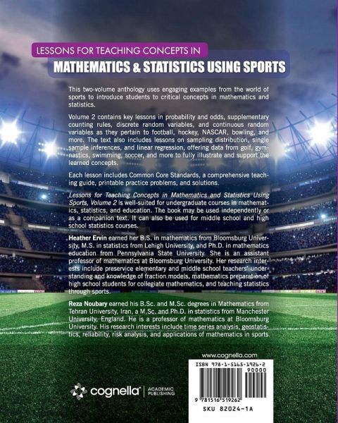 This two-volume anthology uses engaging examples from the world of sports to introduce students to critical concepts in mathematics and statistics. Volume 2 contains key lessons in probability and odds, supplementary counting rules, discrete random variables, and continuous random variables as they pertain to football, hockey, NASCAR, bowling, and more. The text also includes lessons on sampling distribution, single sample inferences, and linear regression, offering data from golf, gymnastics, swimming, soccer, and more to fully illustrate and support the learned concepts. Each lesson includes Common Core Standards, a comprehensive teaching guide, printable practice problems, and solutions. Lessons for Teaching Concepts in Mathematics and Statistics Using Sports, Volume 2 is well-suited for undergraduate courses in mathematics, statistics, and education. The book may be used independently or as a companion text. It can also be used for middle school and high school statistics courses. Reza Noubary earned his B.Sc. and M.Sc. degrees in mathematics from Tehran University, and his M.Sc. and Ph.D. in statistics from Manchester University. He is a professor of mathematics at Bloomsburg University. His research interests include time series analysis, geostatistics, reliability, risk analysis, and applications of mathematics in sports. Heather Ervin earned her B.S. in mathematics from Bloomsburg University, her M.S. in statistics from Lehigh University, and her Ph.D. in mathematics education from Pennsylvania State University. She is an assistant professor of mathematics at Bloomsburg University. Her research interests include preservice elementary and middle school teachers’ understanding and knowledge of fraction models, mathematics preparation of high school students for collegiate mathematics, and teaching statistics through sports.