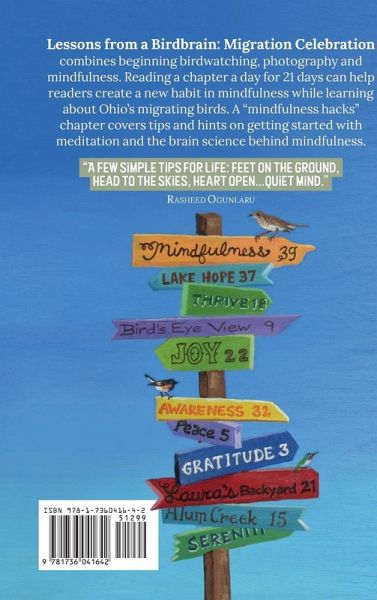 Lessons from a Birdbrain, Migration Celebration introduces you to 21 birds that can be found migrating through Ohio during spring and fall. I took the photos in various locations, largely central Ohio from late September to December. You will notice a wide variation in the quality of the photos because I am a novice photographer. And like the birds migrating through, I'm still growing and transforming and let's face it, some phases of my transformation are lovelier than others. Along with each bird, I include a "birdbrain" lesson that introduces a concept that resonated with me and I associated with the bird and photo mentioned. These are simple things that for whatever reason, I didn't really learn until later in life when I learned to slow my mind a bit using techniques of mindfulness. Or I need to learn again (and again) to catch on. Birding and mindfulness go hand in hand for me because when I am out birding with my camera and binocs I am focused. I am present and intently tuned in to the world around me. And the moment I go to take a photo, I am 100% dedicated to the task at hand quite literally focusing (well attempting to focus...I'm a very novice photographer so sometimes it works better than others.) I imagine it similar to an athlete in a critical moment of a game, where time slows briefly, I still my breath and zoom in for the win. Too corny? Maybe...but it works for me. In my attempts to get great pictures of birds, I also learn repeatedly the lessons of attachment, expectations, success and failure. I can't control what birds will be around when I go out, what the light will be when the perfect bird lands in my range or even if my camera battery is about to konk out. I can prepare, I can plan but I can't force outcomes. And I can learn to take the failures in stride OR I can brood, crank, stomp and whine. This ability to allow brief moments of disappointment or elation to pass has been a key for me to rise above the tendency I have to get caught up in a thought groove, good or bad. The greatest gift I've received from birding is that ability to step aside and "see" my thoughts and feelings from a distance, so to speak. I have specifically selected 21 chapters to coincide with the number of days it takes us humans to have a habit begin to take hold. During the course of 21 days, I encourage you to read a chapter and reflect on the lesson at hand. Can you step aside and let a worry pass because worrying is just wasted energy? Can you mindfully experience a precious moment more fully by recognizing its impermanence? Spring and fall are particularly transitional in Ohio and the birds who travel through at the time are fleeting in every sense of the word. More important than finding a warbler you've never seen before, I hope you find a "birdbrained" lesson or two or ten that speak to you. In other words, you hear the right idea at the right time in your life that allows you to step aside from your thoughts, get untangled from a feeling and regain balance and serenity from the lesson that bird(s) bring(s).